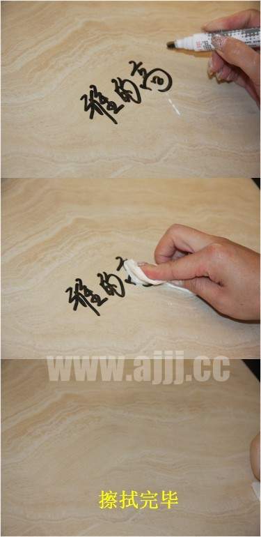 小编用黑色墨笔在磁砖上写下了品牌的名字"雅的高",几分钟过去之后,字迹已经风干,小编用纸巾轻轻擦拭。不费吹灰之力便把字迹清理干净了,说明墨水并没有被吸收掉;可见,这款产品对付日常的生活污渍是毫无压力,我们以后再也不用为清理卫生而烦恼了。