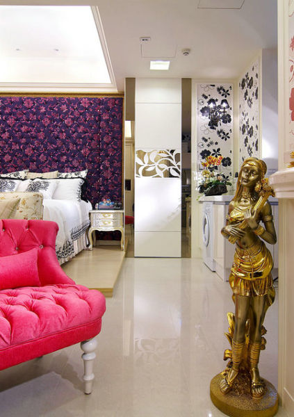 设计师高明的用色,调和适当的轻重深浅比例,让睡眠区彷佛被繁花绽放的美丽景色包围。底部贴上茶镜的雕花镂空壁板,以两侧不对称的手法,营造灵动的墙面风情。