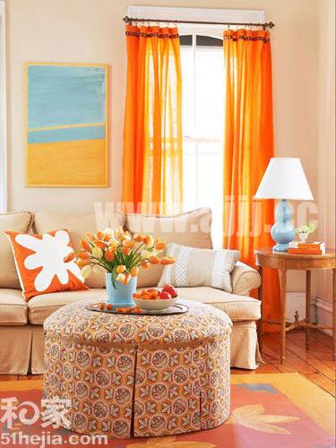无论是裸色的墙面,米色的布艺沙发,还是橙色的窗帘和地毯,“你中有我,我中有你”的配色方案让这些暖色调在整体上保持和谐统一。其中适当的留白实现了恰当的缓冲,以免造成亮色的视觉疲劳,空间的色彩也能保持均衡。