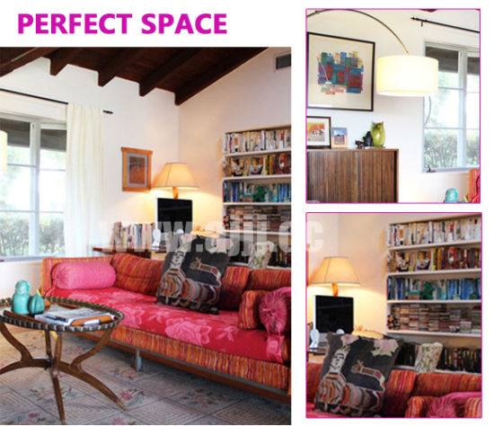 光线充足的客厅,浅咖啡色的地毯搭配深咖啡色的收纳柜和茶几,突出颜色渐变的动态。搭配橘红色和桃红色搭配的沙发,人的视线瞬间集中到沙发上,给人以强烈的视觉冲击。代替纯色地毯,直线回路花纹的更能增加室内线条的层次感。