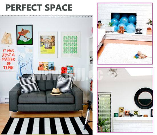 白色沙发、墙壁、壁炉和地毯的奶白色和黑色的沙发座、壁炉上面的黑色镜框搭配出来的黑白配,白色色块较大,空间的视觉面积也较大。壁炉里蓝色的气球,和室内的白色搭配一起,给人蓝天白云的清新感。壁炉和沙发后面的中国国画壁画搭配,给人以大方不俗套不累赘的亚洲风。