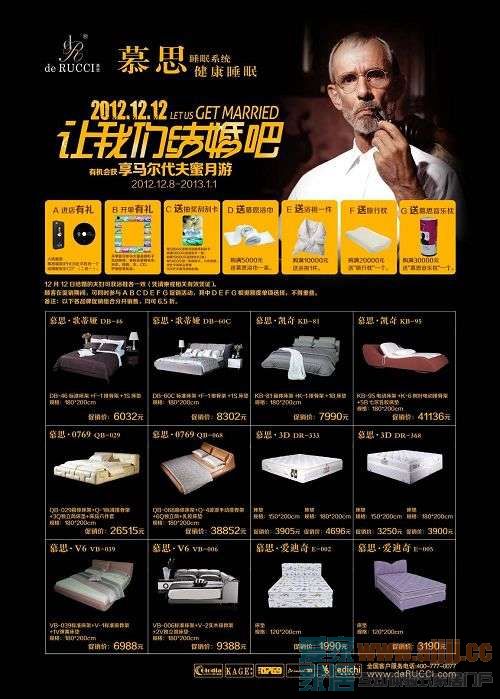 据了解,慕思此次的跨年让利活动为"2012.12.12让我们结婚吧"。共推出5大让利举措,分别为到店有礼送慕思精美手机壳或睡眠音乐CD;开单有礼即有机会获得毛巾、浴巾、拖鞋、伞、CD、护颈枕等奖品;每5000元送马尔代夫蜜月游抽奖刮刮卡;以及送精美赠品和婚庆特价款,慕思·歌蒂娅、凯奇、0769、3D、V6、爱迪奇等6大品牌全线产品特价发售。