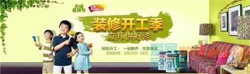 (2013年3月12日)错过双十一不用遗憾,阳春三月装修好时机!天猫平台网聚立邦等25大顶尖家装品牌于3月22-24日间举办盛大促销活动。期间,堪比双十一的优惠力度及一站式服务理念将为消费者量身打造一场既实惠又便捷的装修节盛宴。作为参加本届天猫装修节的涂料品牌,立邦官方旗舰店(http://nipponpaint.tmall.com/)将以令人惊喜的 “大尺度”折扣迎接消费者的点击惠顾。