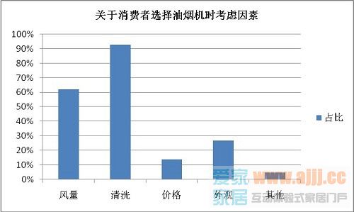 日前,中国电子商会消费趋势调查中心发布了"关于消费者选择油烟机时考虑因素"调查结果,结果显示,有93%的人在选择油烟机时比较看重产品的清洗问题,有62%的人在选择油烟机时比较看重产品的风量大小,有27%的人在选择油烟机时比较看重产品的外观设计,有14%的人在选择油烟机时比较看重产品的价格高低。由此可见,油烟机的清洁诉求已经取代了以前对风量、外观的需求,成为消费者考虑的首要因素。这在记者对终端市场的实地走访中也得到了印证。